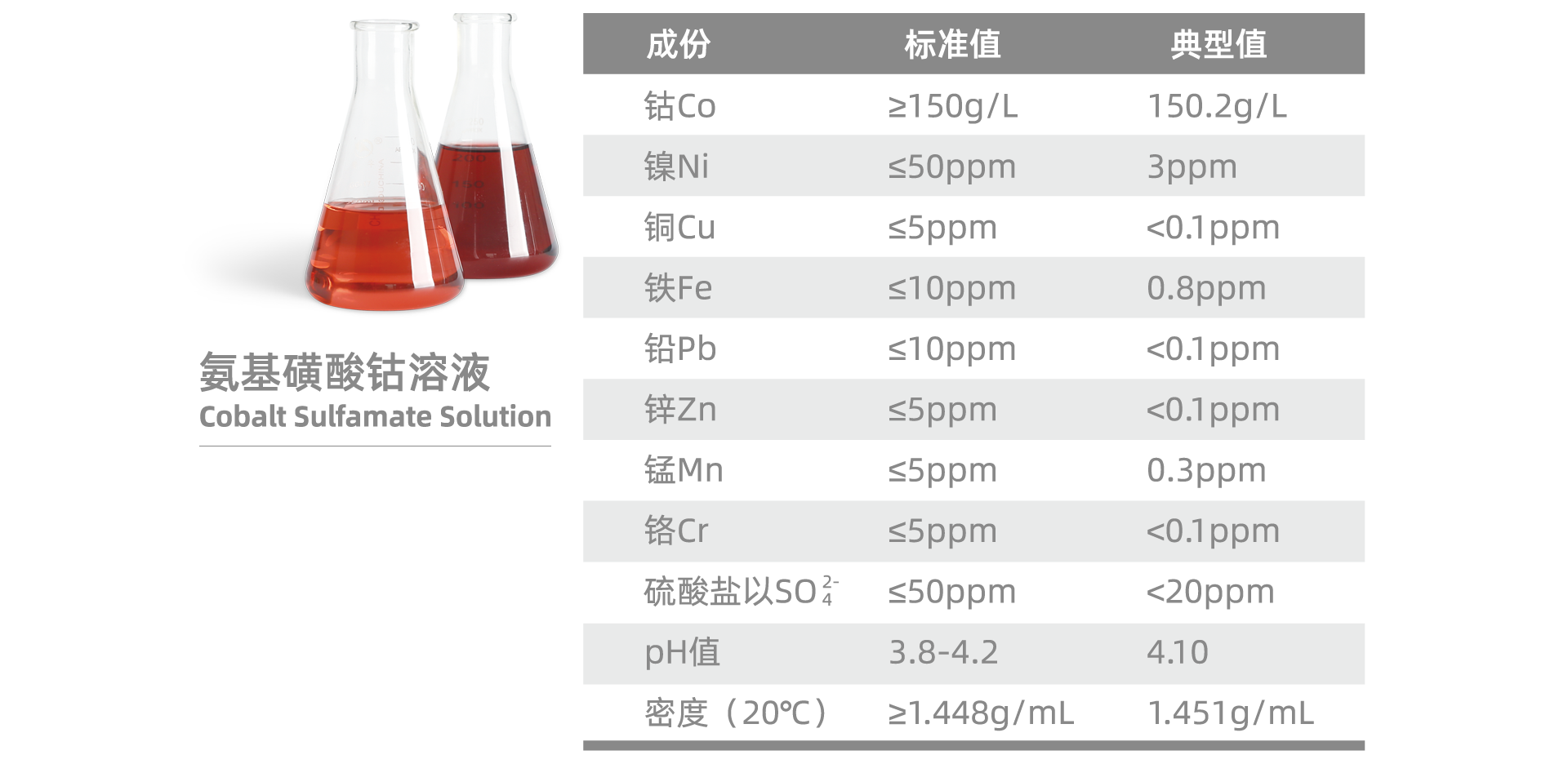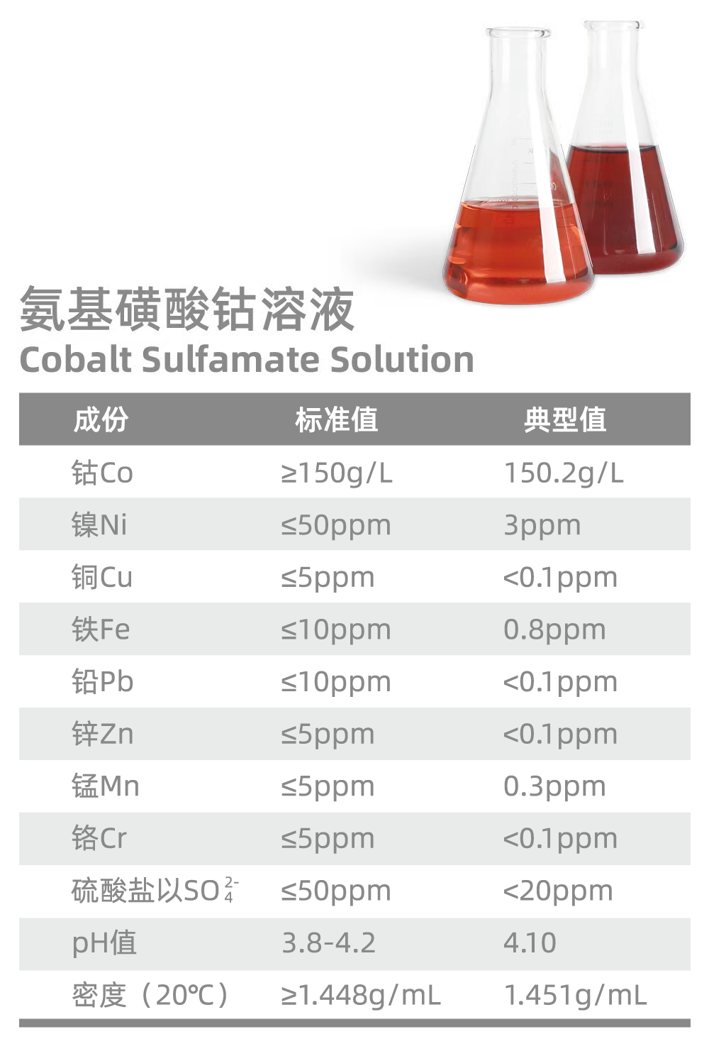 氨基磺酸鈷溶液(Cobalt Sulfamate Solution) 分 子 式:Co(NH2SO3)2 分 子 量:250.99 性 狀:紅色透明液體。 用 途:主要用于精密電鍍、電鑄、電子工業等。 包 裝:HDPE桶裝,每桶30公斤。 儲 運:運輸時包裝要密閉,運輸過程中防止受熱,貯存在陰涼,通風處